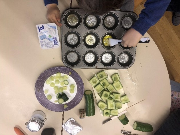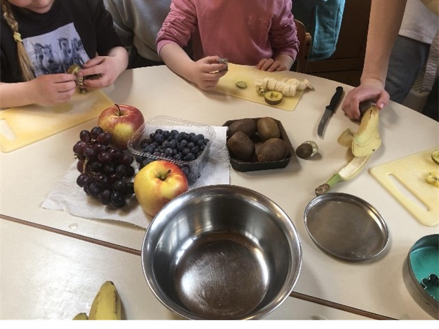 Dies erfolgte durch das Zubereiten einer gemeinsamen Brotzeit und einem spielerischen Kennenlernen der Nahrungsmittel. In der Vorbereitungsphase haben wir unter Anderem ein kleines Rezeptheft erstellt, welches alle Rezepte beinhaltet, die an dem Tag im Kindergarten zubereitet wurden, damit die gesunde Küche auch zu den Kindern nach Hause kommen kann.