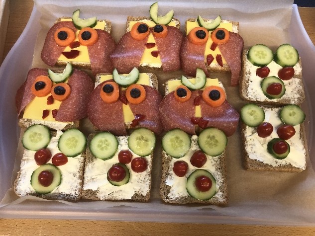 Zur Brotzeit haben wir dann unter Anderem einen Obstpfau, lustige Sandwicht-Gesichter und frisch gepressten ACE-Saft hergestellt.