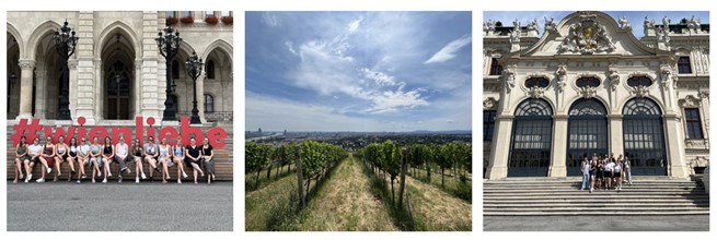 Nach einem Herzschlagfinale zwischen dem verspäteten Zug aus Holzkirchen und dem abfahrbereiten Zug nach Wien und der höflichen Aufforderung einzusteigen, fuhren wir am frühen Morgen vom Rosenheimer Bahnhof vollzählig ab. Die Fahrt verbrachten wir teilweise schlafend und mit der Hoffnung an den Zwischenhalten unseren Sitzplatz nicht durch eine Reservierung zu verlieren. In Wien angekommen, machten wir erste Erfahrungen mit den U-Bahnen und der immensen Hitze, welche uns die Woche über begleiten sollten. Nach dem Beziehen unserer Zimmer und ein wenig Erholung von der Zugfahrt, machten wir uns auf, um die Stadt zu erkunden. Auf dem Plan standen beispielsweise das Parlamentsgebäude und das Volkstheater. Außerdem besichtigten wir den Justizpalast, in dem der Oberste Gerichtshof seinen Sitz hat. Auf dem Weg zwischen den verschiedenen Orten machten wir Bekanntschaft mit Trinkbrunnen Brunnhilde und Stelen, welche mit Wassernebel für eine angenehme Abkühlung sorgten. Am Abend besuchten wir gemeinsam das Musikfestival am Rathausplatz, wo es gleichzeitig viele Stände mit Essen und Getränken gab. Auf einer riesigen Leinwand wurden ein Konzert mit Lady Gaga und Tony Bennett gezeigt, gefolgt von Lewis Capaldi.