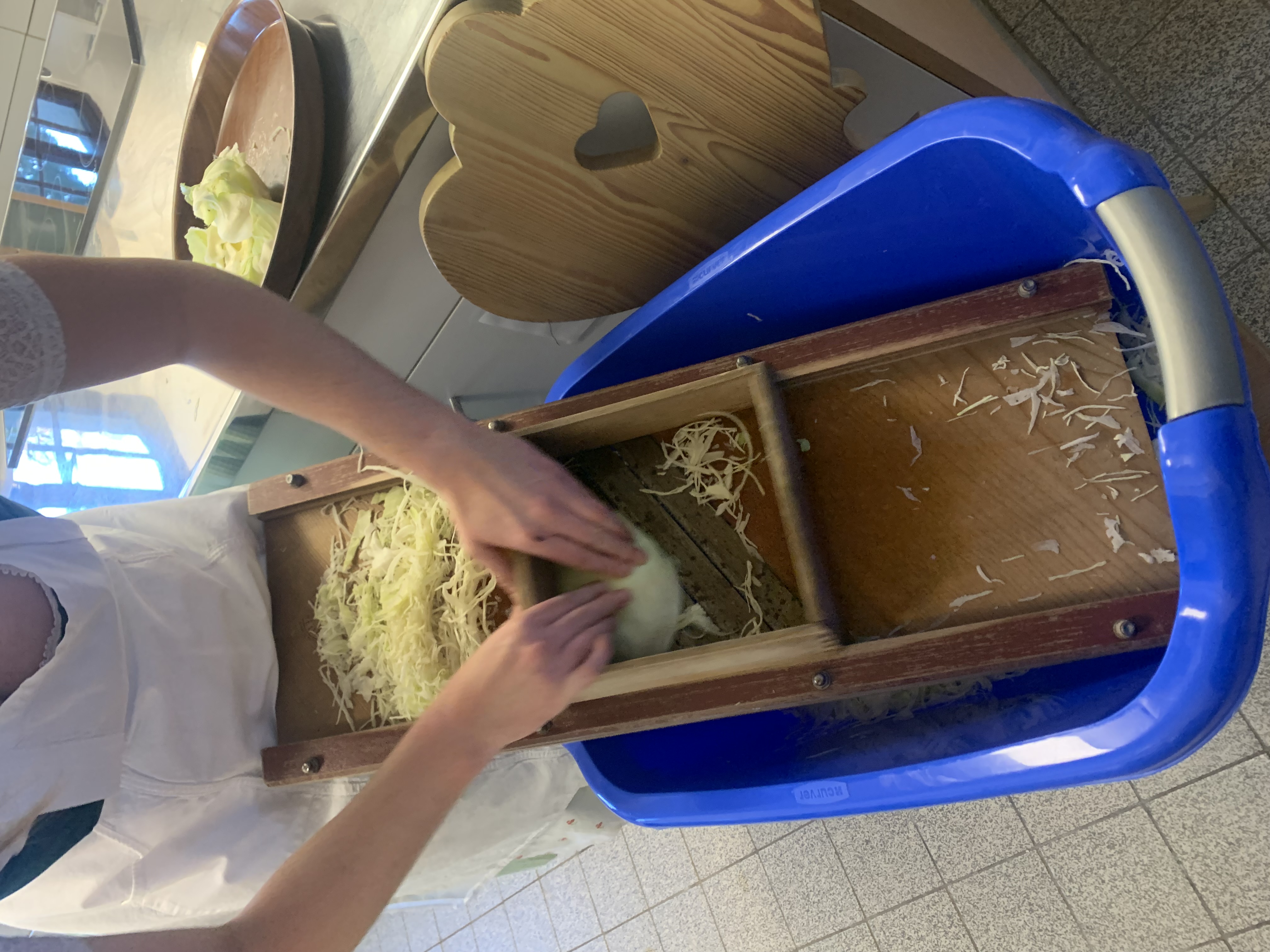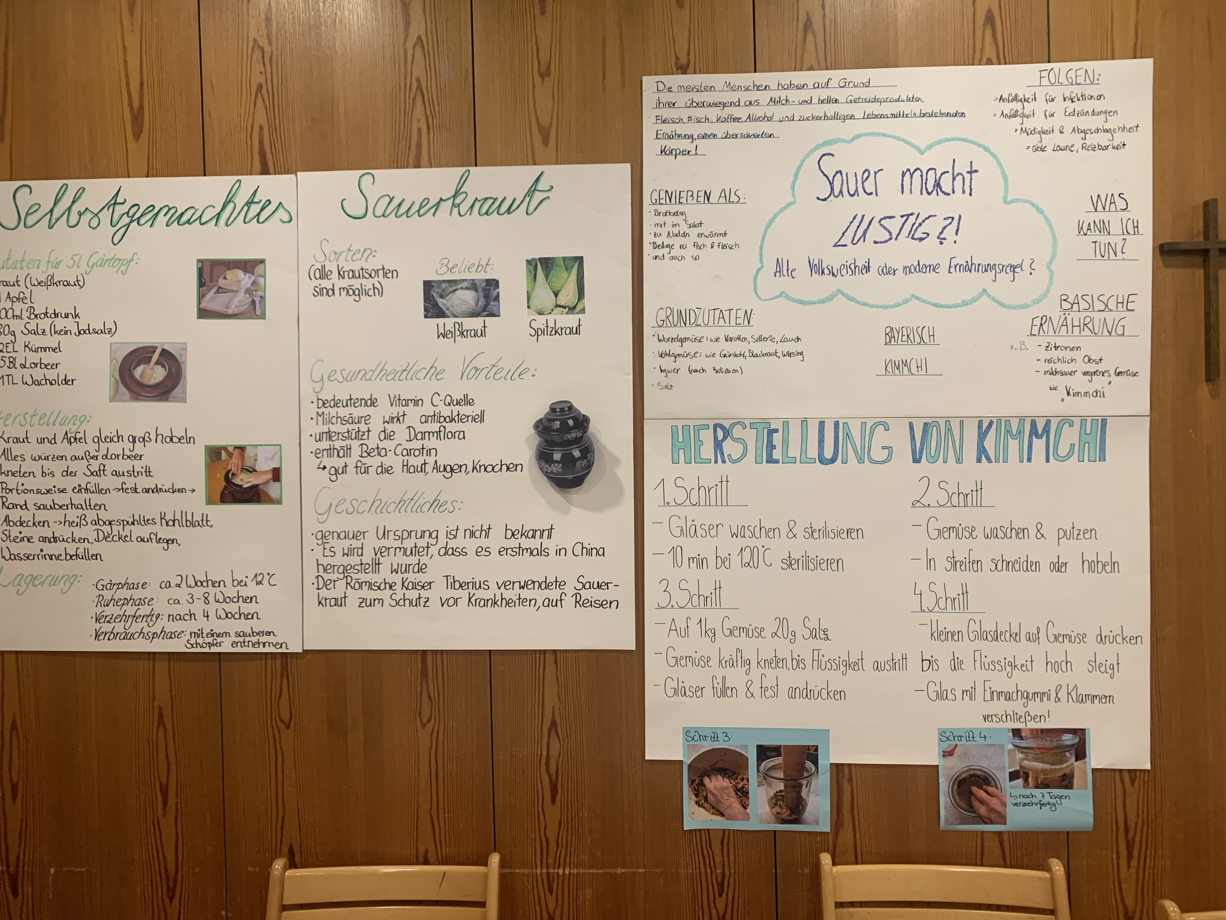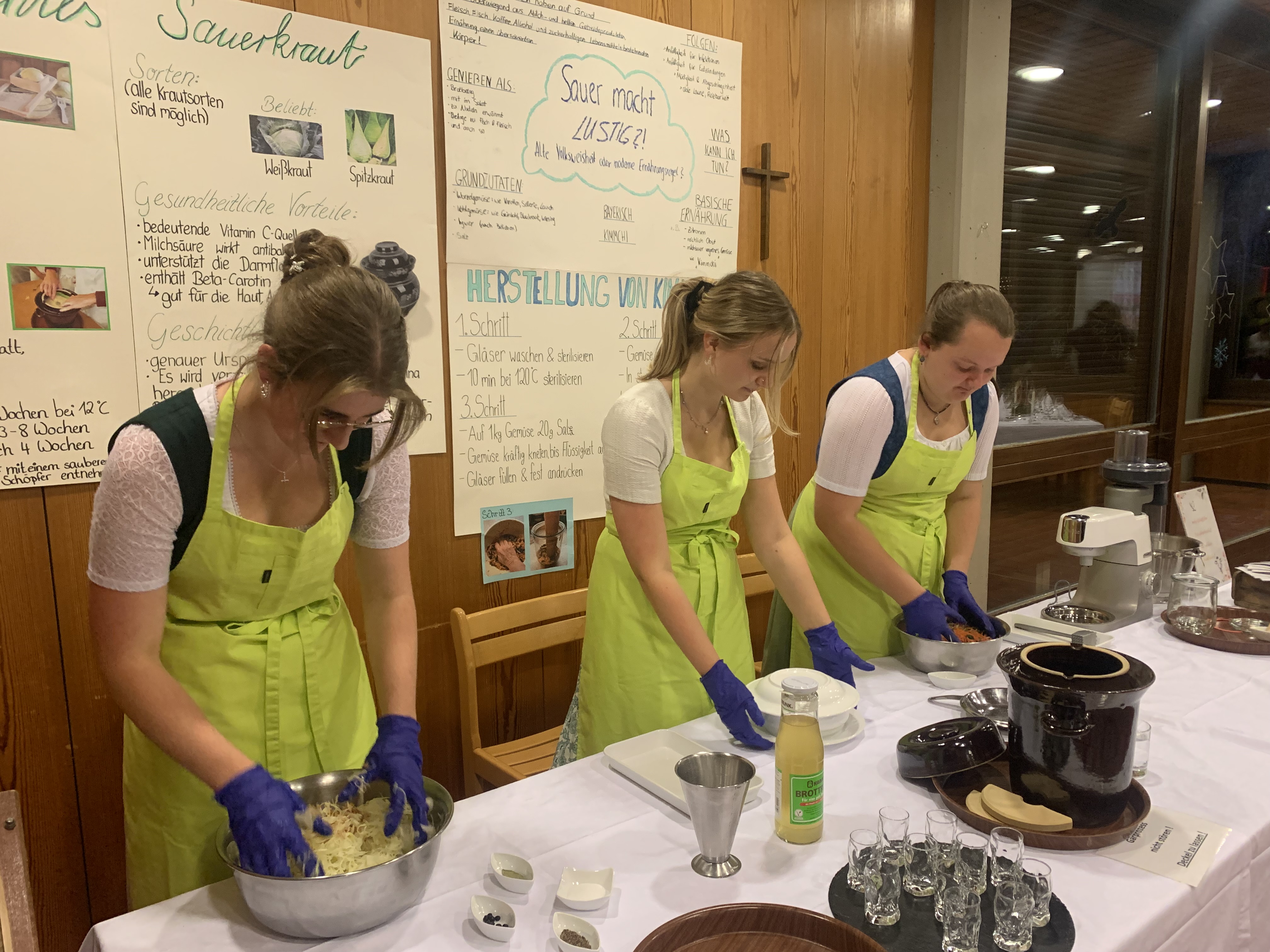 Am Informationsabend des BSZ-Miesbach haben die Schülerinnen der BFS EV 11 und 12 den interessierten Besuchern die gesundheitlichen Vorteile von fermentiertem Gemüse nahe gebracht. Sie demonstrierten die Herstellung von traditionellem Sauerkraut und dem Trendprodukt Kimmchi. Unterstützt wurden sie von der FAKEVM 2, die aus dem zuvor im ländlichen Modul-Unterricht produziertem Sauerkraut und Kimmchi leckeres Fingerfood als Kostproben für die Gäste gezaubert hatte.